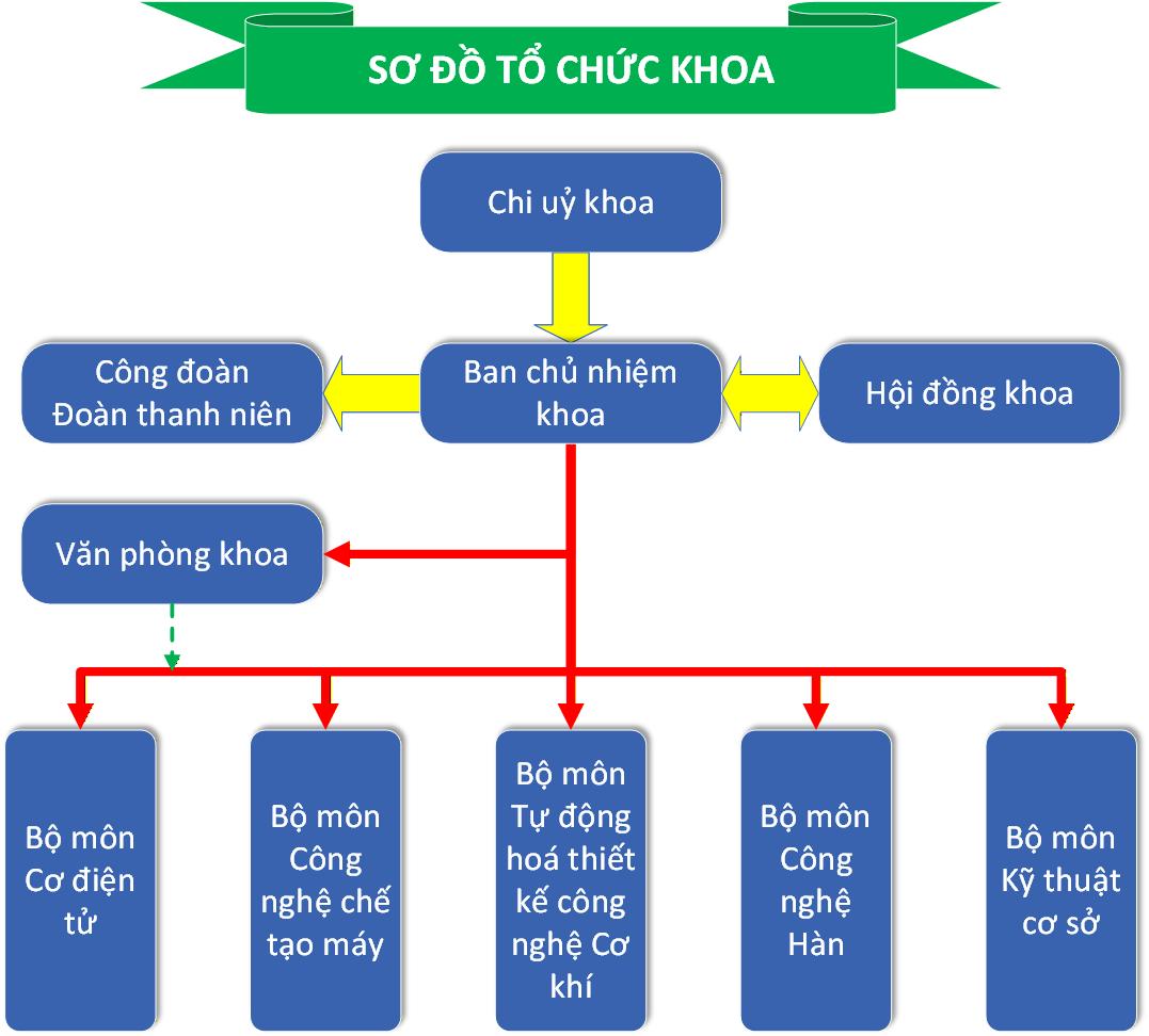 Hiện nay, khoa Cơ khí bao gồm Chi ủy khoa, Ban chủ nhiệm khoa, Hội động khoa, các Bộ môn, Công Đoàn và Đoàn Thanh niên được tổ chức như sau: